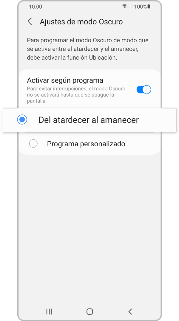 Puedes configurar el modo oscuro para que se active o desactive automáticamente. Sigue los pasos a continuación para activar automáticamente el modo oscuro al atardecer o en un momento específico. Incluso si estableces una hora programada para el modo oscuro, aún puedes encenderlo o apagarlo manualmente cuando lo desees.