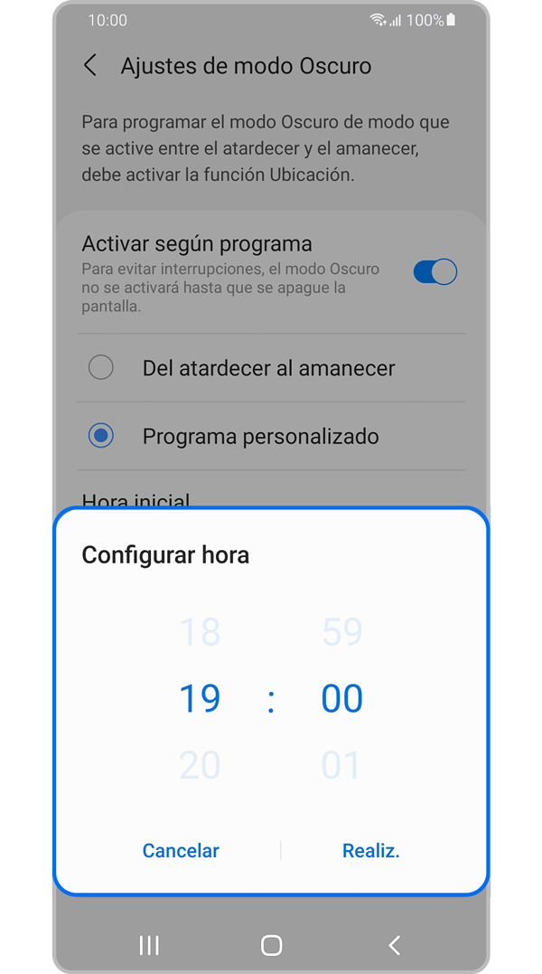 El modo oscuro te permite reducir la fatiga visual cuando usas el dispositivo por la noche o en un lugar oscuro. También puedes establecer un horario para aplicar el modo oscuro. Si el modo oscuro está habilitado, sigue los pasos a continuación para apagarlo.