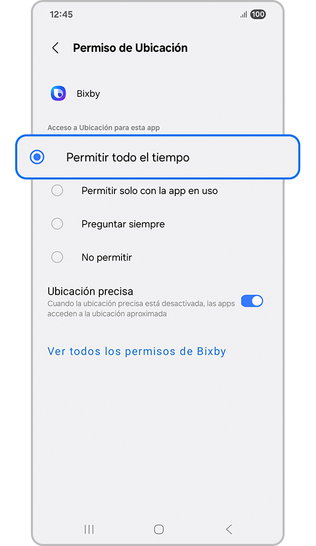 Permitir todo el tiempo: La aplicación puede acceder a la ubicación incluso cuando se ejecuta en segundo plano.