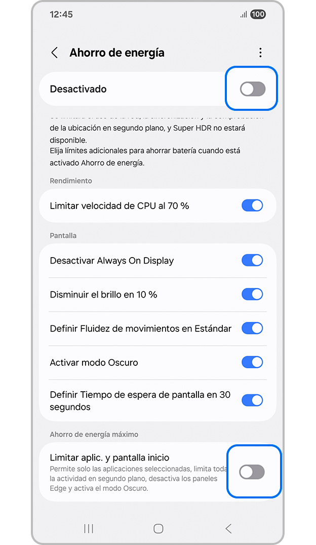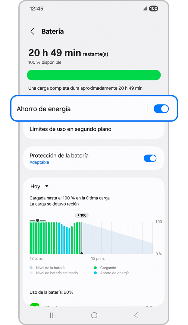 Ve a Ajustes y selecciona Cuidado del dispositivo, luego en Batería> Ahorro de energía. Luego pulsa los tres puntos de la parte superior derecha y selecciona Ahorro de energía adaptable. Asegúrate que esta opción esté desactivada.