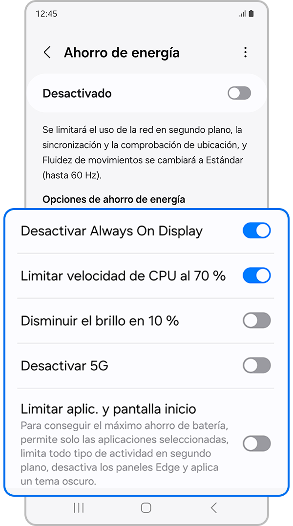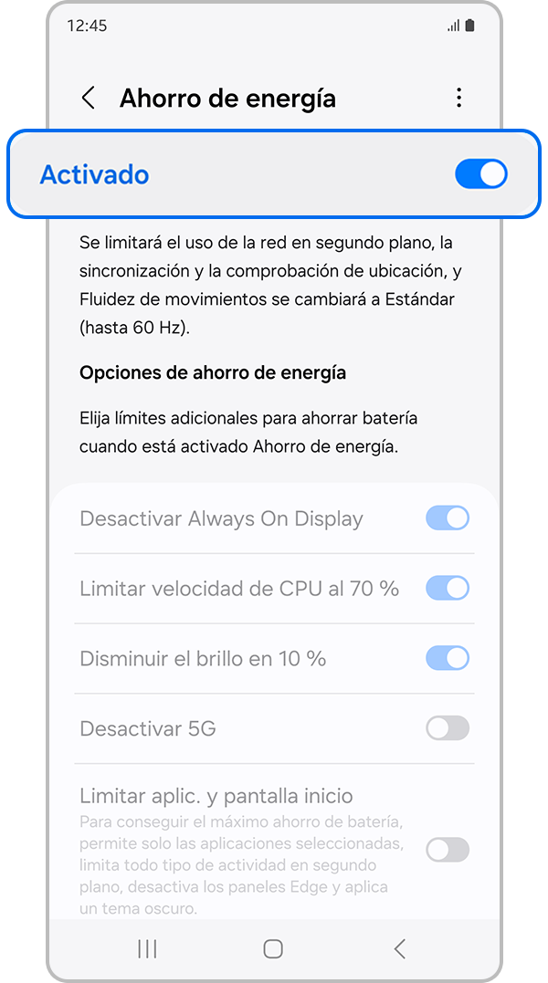 Usar el modo de ahorro de energía puede afectar el rendimiento de las aplicaciones y del dispositivo. Algunas tareas y funciones pueden tardar más en completarse o actualizarse. Además, es posible que las aplicaciones que se ejecutan en segundo plano no reciban actualizaciones ni te envíen notificaciones cuando el modo de ahorro de energía esté activado.