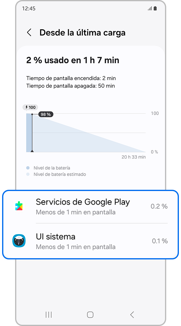 Podrás consultar información sobre el uso de las aplicaciones, junto con el tiempo de pantalla encendida y el tiempo en ejecución en segundo plano. Así, podrás identificar qué está consumiendo la batería de tu dispositivo.