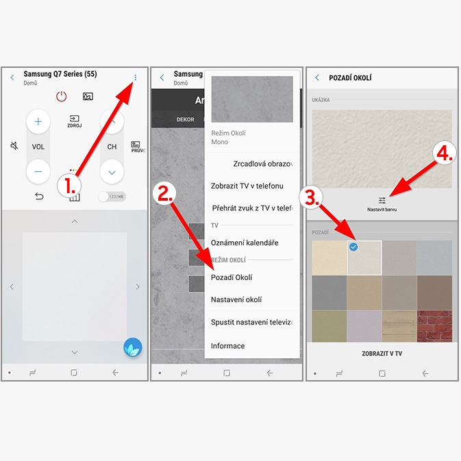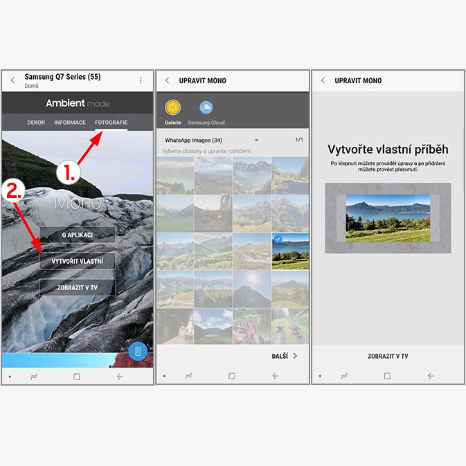 Pro detailnější nastavení, nahrání vlastních fotografií, vytváření vlastního pozadí a další volby a možnosti využijte nastavení režimu Ambient Mode pomocí mobilní aplikace SmartThings. (Google Play, App Store)