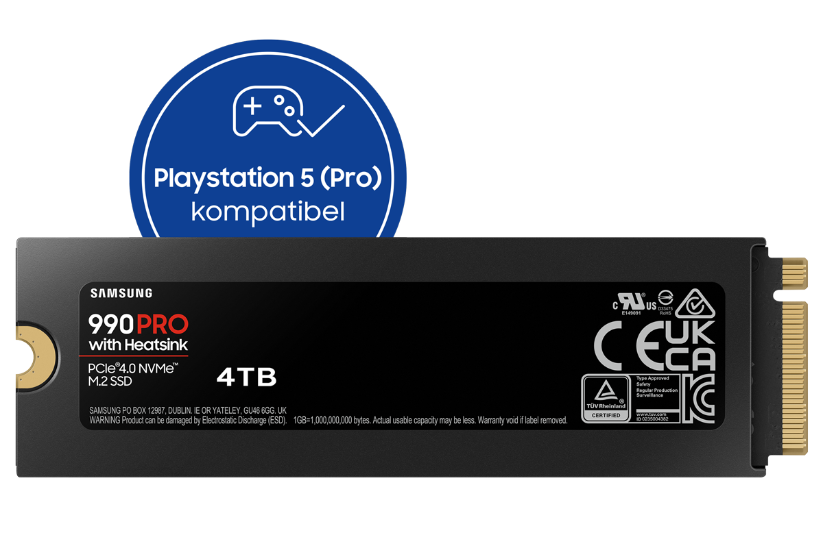 Setze alles auf Sieg mit der 990 PRO Heatsink. Das 4-TB-Modell unterstützt dich mit zufälligen Lesegeschwindigkeiten von bis zu 1.600K IOPS. Genieße schnelle Ladezeiten auf deinem PC oder deiner Playstation 5 und lass die SSD frischen Wind in deine Spiele bringen.