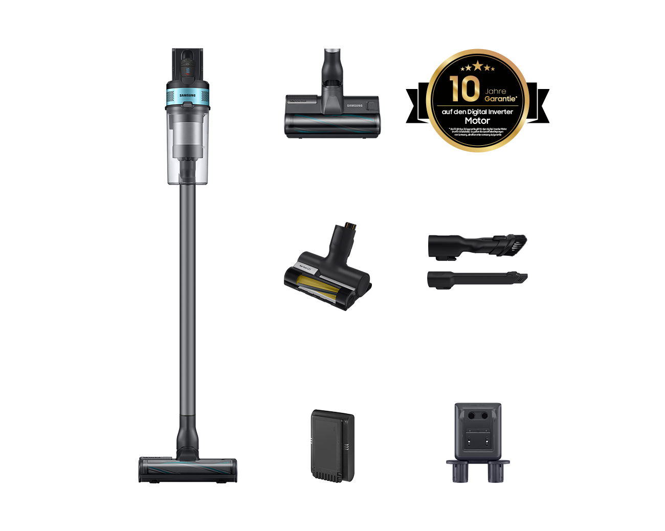 *Geprüft in internen Tests nach IEC 62885-4 Abschnitt 5.8 unter Verwendung des Jet-Modus am Einlass eines nicht motorisierten Zubehörteils mit voll geladenem Akku. Die tatsächlichen Ergebnisse können je nach Nutzungsverhalten und Umgebungsbedingungen variieren. ** Geprüft in internen Tests nach IEC 60335-1 Abschnitt 10 *** Die 10-jährige Teilegarantie gilt für den Digital Inverter Motor in Handstaubsaugern und Saugrobotern. Die Teilegarantie umfasst nur das zur Reparatur benötigte Ersatzteil. Weitere Kosten (z.B. Transport, Ein- und Ausbaukosten, etc.), sind nicht umfasst. Es gelten die Garantiebedingungen von Samsung, abrufbar unter www.samsung.com/de/support/warranty/