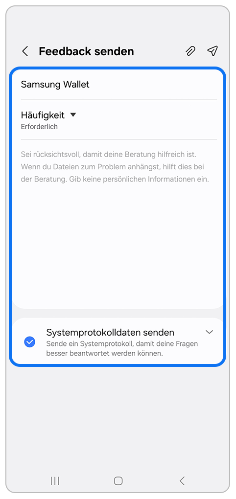 Wie versende ich mit der Samsung Wallet App einen Fehlerbericht?