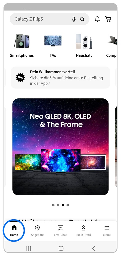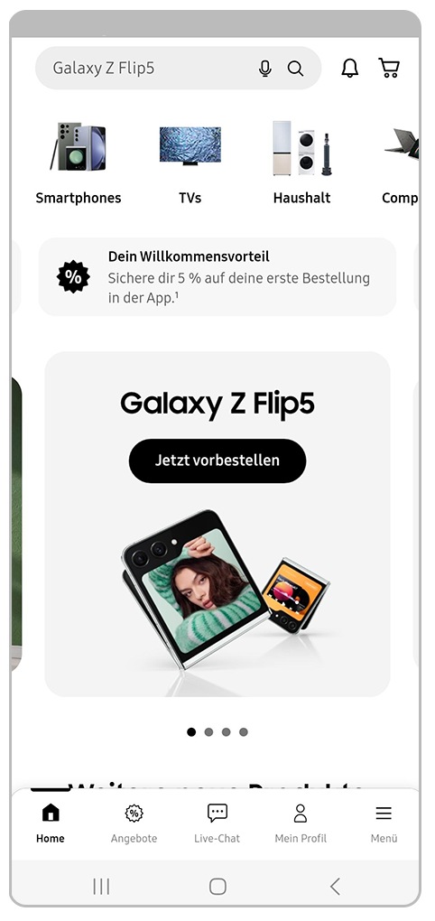 Kennst du schon die Samsung Shop App? Hier findest du exklusive Deals und Angebote. Schau gleich nach, ob du einen Rabatt als Willkommensvorteil erhältst. Nutze praktische Funktionen der App, die Wunschliste, Samsung Rewards, Gutscheine sowie den Live-Chat.