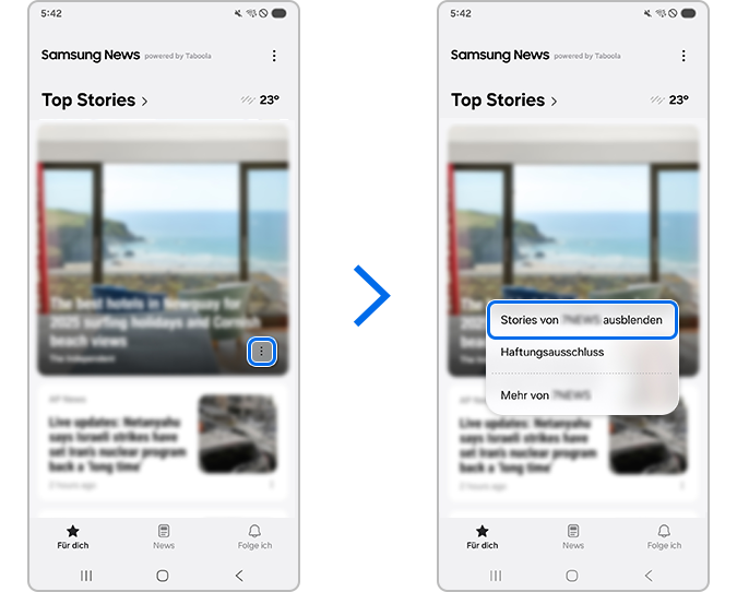 Du kannst ausgeblendete Quellen jederzeit über Samsung News > Einstellungen > Ausgeblendete Quellen und Themen wiederherstellen.