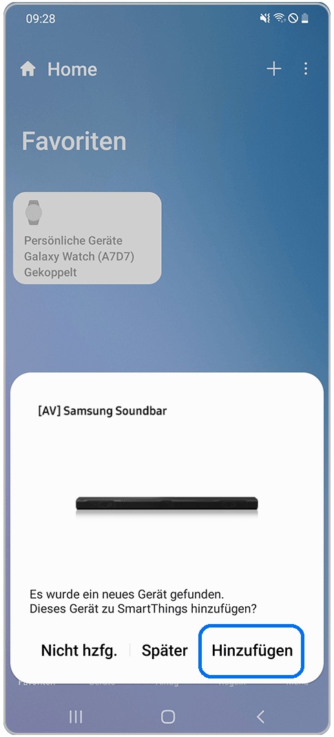 Wenn du die SmartThings-App auf deinem Mobilgerät aktivierst, erkennt sie automatisch eine Samsung Soundbar in der Nähe und zeigt ein Registrierung-Pop-up-Fenster an.