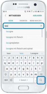 Lege fest, zu welcher Mahlzeit du Kalorien erfassen möchtest und gebe im Suchfeld ein, was du gegessen hast. Tippe anschließend auf das Lupen-Symbol, um sich verschiedene Ergebnisse anzeigen zu lassen.