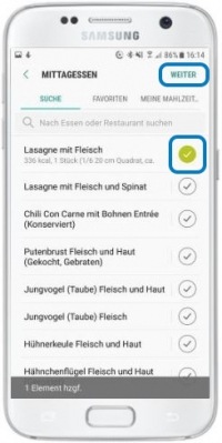 Wähle aus der Liste dein Essen aus, indem du an entsprechender Stelle auf das Häkchen-Symbol und zur Bestätigung auf WEITER tippst.
