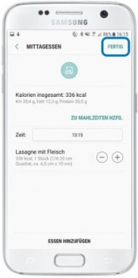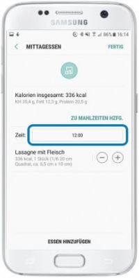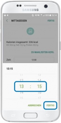 Möchtest du den Zeitpunkt deiner Mahlzeit anpassen, weil du beispielsweise Mahlzeiten nachträgst, tippe auf das Uhrzeit-Feld und stelle die entsprechenden Werte ein und bestätige diese, indem du auf FERTIG tippst.