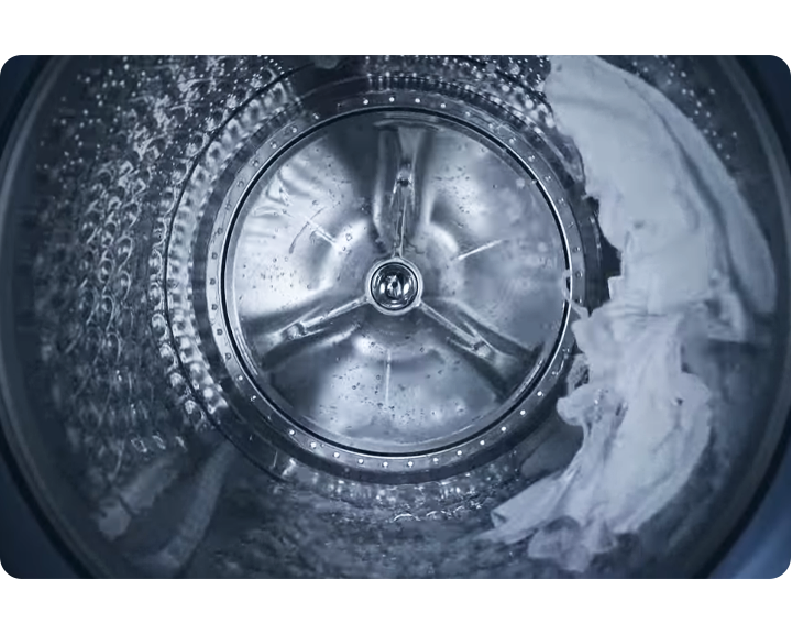 Die Bespoke AI Waschmaschinen sind mit einer Zirkulationspumpe ausgestattet. Sie pumpt das Wasser aus der Trommel nach oben, sodass die Wäsche schneller durchnässt wird. Im Gegensatz zu herkömmlichen Waschmaschinen, bei denen die Trommel von unten mit Wasser gefüllt wird, verbraucht eine Maschine mit Zirkulationspumpe weniger Wasser. Durch die angepasste Wassermenge wird weniger Energie benötigt, um das Wasser zu erhitzen. Das spart bei jedem Waschgang Energie.