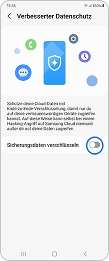 Wenn der erweiterte Datenschutz aktiviert ist, wird auf Geräten, die diese Funktion unterstützen, bei der Datensicherung in die Samsung Cloud eine Ende-zu-Ende-Verschlüsselung angewendet und mit den Daten gesichert.