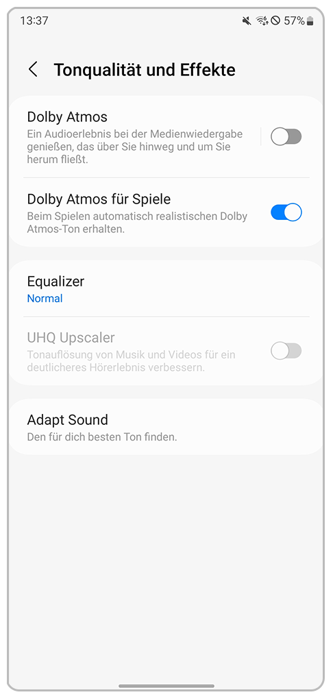 - UHQ Upscaler: Verbessere die Tonauflösung von Musik und Videos, wenn du kabelgebundene Kopfhörer verwendest. Nutzt du Bluetooth-Kopfhörer, ist die Funktion nicht verfügbar.