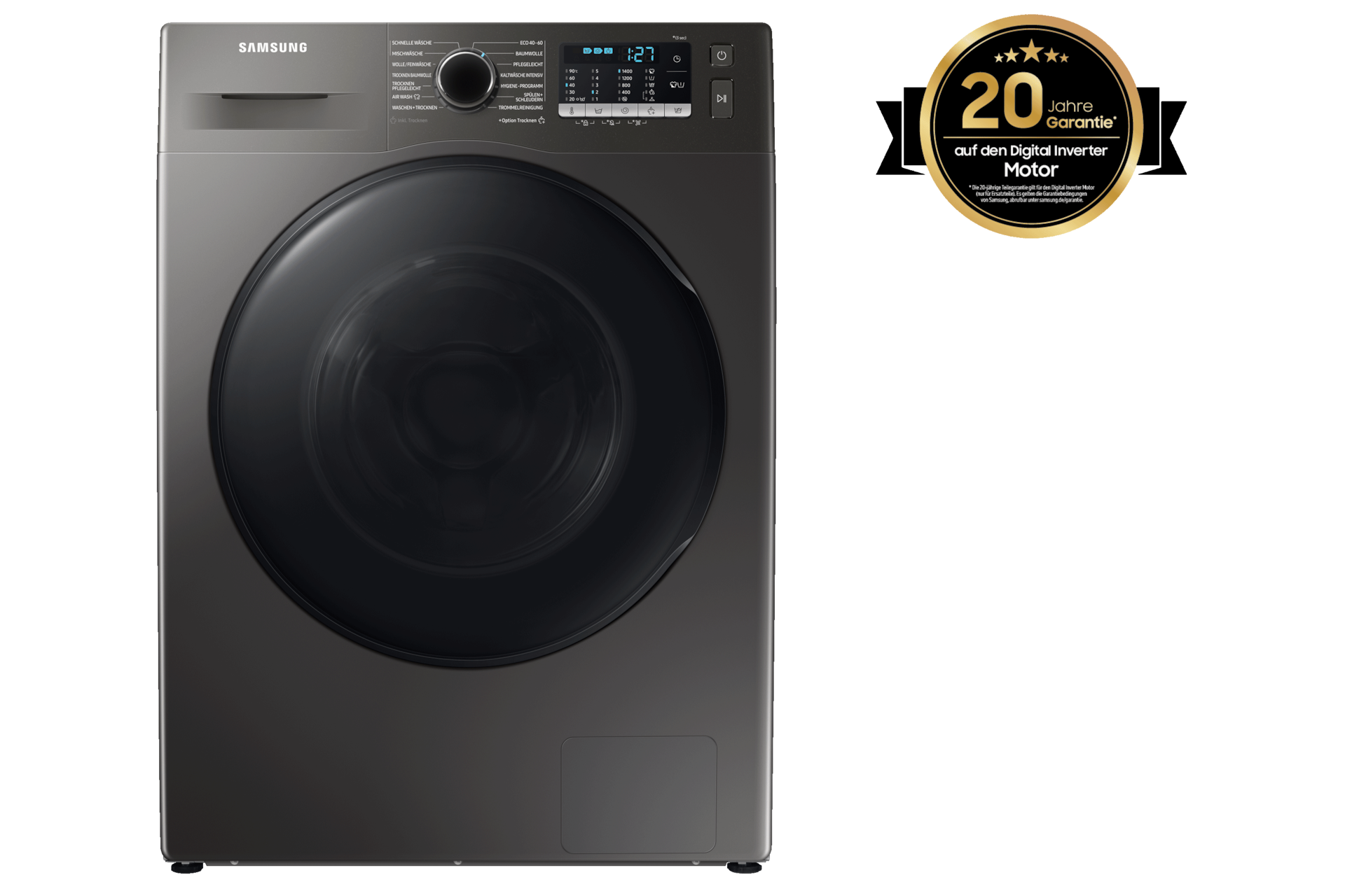 * Die 20-jährige Teilegarantie gilt für den Digital Inverter Motor in Waschmaschinen, Waschtrocknern und Trocknern. Die Teilegarantie umfasst nur das zur Reparatur benötigte Ersatzteil. Weitere Kosten (z.B. Transport, Ein- und Ausbaukosten, etc.), sind nicht umfasst. Es gelten die Garantiebedingungen von Samsung, abrufbar unter www.samsung.com/de/support/warranty/.