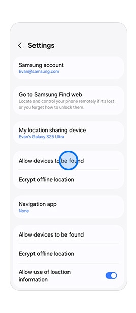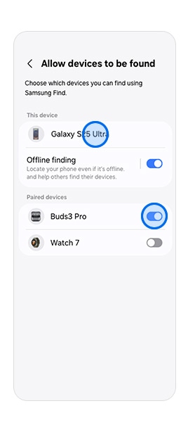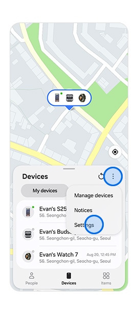 Enheder logget ind med den samme Samsung-konto, der bruges til at logge ind på Samsung Find ― Galaxy Smartphone, Galaxy Tab, Galaxy Book, osv. ― vil fremgå på "Enheder"-fanebladet. Derudover vil enheder som wearables, der forbinder til primære enheder via Bluetooth ― Galaxy Buds, Galaxy Watch, Galaxy Ring og S Pen ― også fremgå.