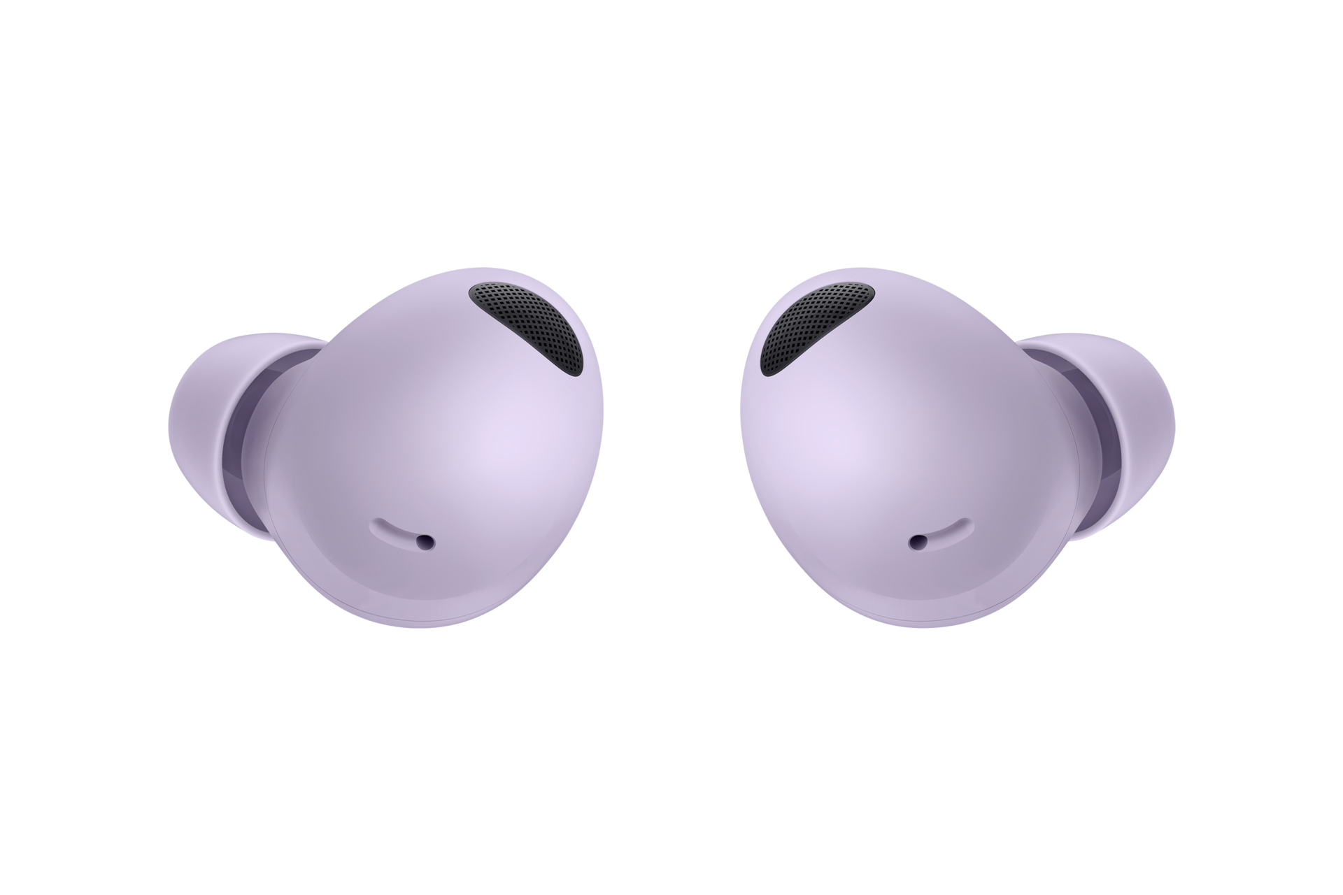 To Galaxy Buds2-hovedtelefoner i Bora Purple svæver midt på skærmen.