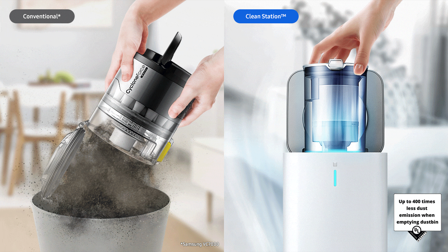Nyd en mere praktisk måde at tømme støvbeholderen på. Tag helt enkelt støvbeholderen af og sæt den øverst på rengøringsstationen, og støvet tømmes automatisk uden, at du skal tage slangen eller cyklonen af. Det er meget lettere end den manuelle tømning af støv.