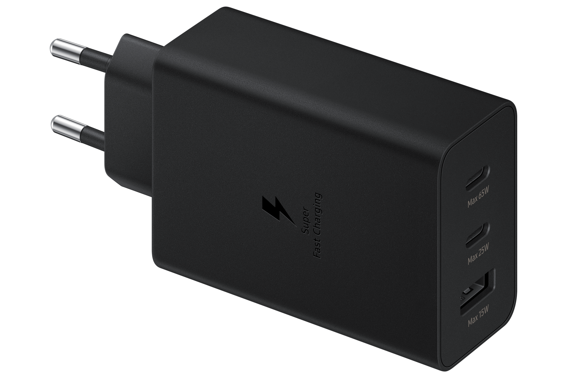 *Charging cable is not included.**Power outputs for a single versus multiple devices vary as follows: Up to 65W when charging a single device under PD 3.0 and SFC(Super Fast Charging) 2.0 conditions with USB-C. Up to 25W when charging a single device under PD 3.0 and SFC(Super Fast Charging) conditions with USB-C. Up to 15W a single device under AFC(Adaptive Fast Charging) conditions with USB-A. This adapter can charge up to 3 devices simultaneously with 65W maximum total output power as with 35W, 25W, and 5W respectively. Actual charging speed may vary depending on the number of devices.***Super Fast Charging (SFC) is Samsung's fast charging method supported for Galaxy Notes (Note10 and higher), Galaxy S Series (S10 5G and higher), and other SFC capable devices such as iPhones (iPhone8 or higher), Adapative Fast Charging (AFC) is fast charing portocol for Samsung devices.****SFC 2.0(45W) is available on Galaxy S20 Ultra, Note10+ and higher. Other devices may be added in the future. *****USB PD 3.0(Power Delivery) is USB IF standard to charge quickly over USB-C. It is recommended to use USB standard cable.******PD 65W & SFC 45W requires 5A cable.