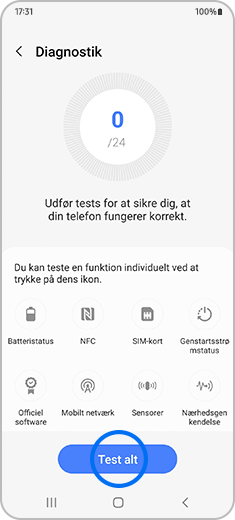 Følg anvisningerne på skærmen for at teste, hvordan godt din smartphone fungerer. Du kan springe dele af processen over og gå tilbage til dem, når du har lyst. Hvis du gerne vil gennemgå en bestemt funktion i din smartphone, trykker på du bare på ikonet for at begynde testen.