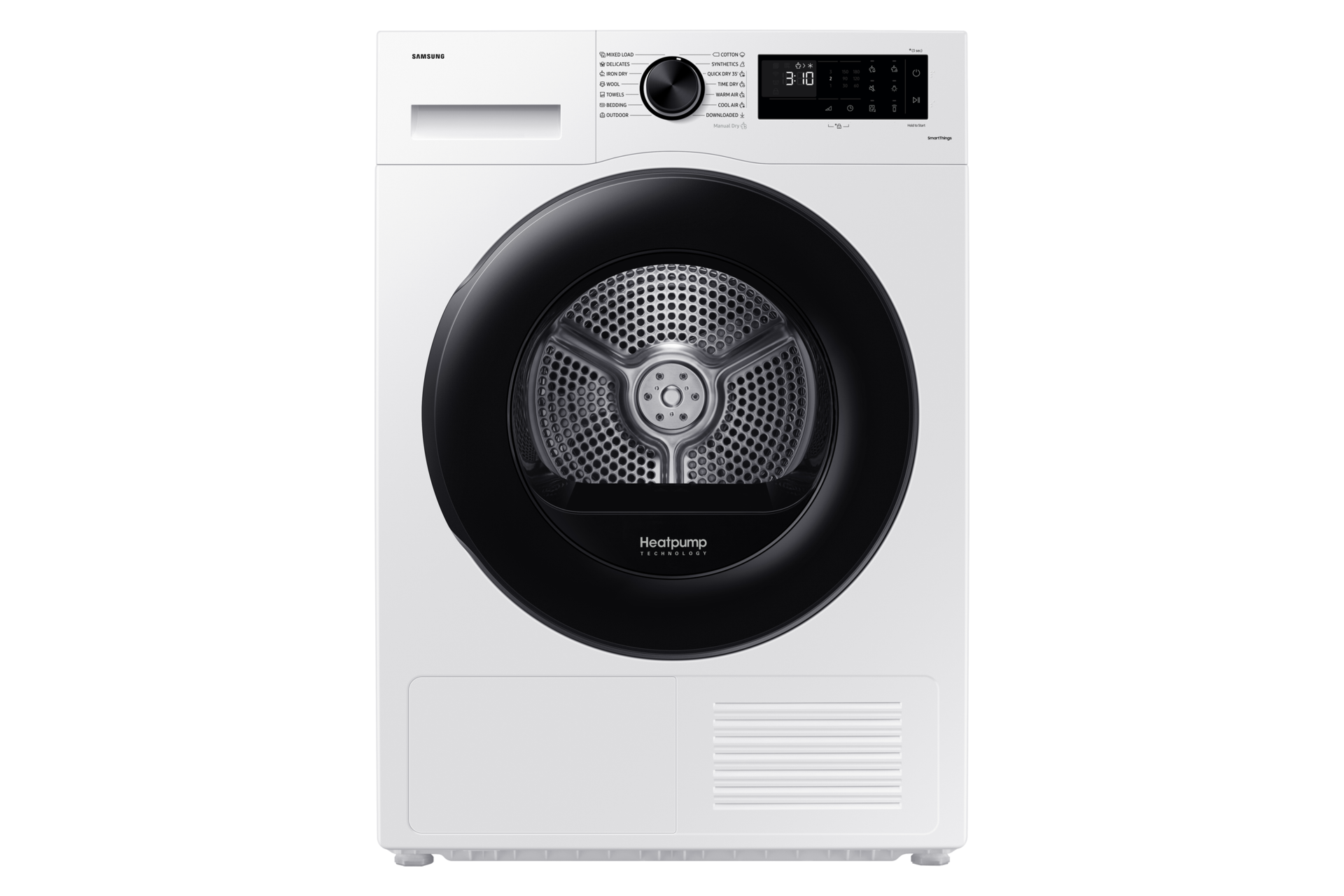 * Baseret på intern test i overensstemmelse med IEC 61121:2013 med 8 kg vasketøj med tørreprogram Bomuld og indstilling Skabs tørt, med tørretumbler med varmepumpe (DV80F5E4HGW) kontra uden varmepumpe (DV80H4100CW). Individuelle resultater kan variere.