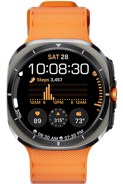 En Galaxy Watch Ultra ses i dagslys. Når natten falder, og himlen bliver mørk, lyser Night Mode-urskiven på urens skærm.