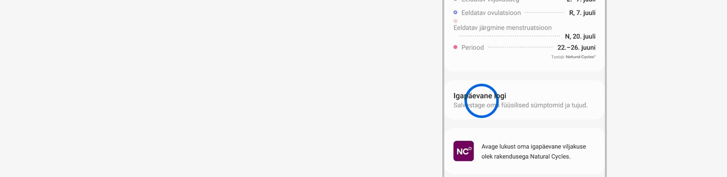Tsükli jälgimine võib olla sinu Samsung Health avakuval juba saadaval. Kui see nii ei ole, saad selle aktiveerida, toimides järgmiselt.