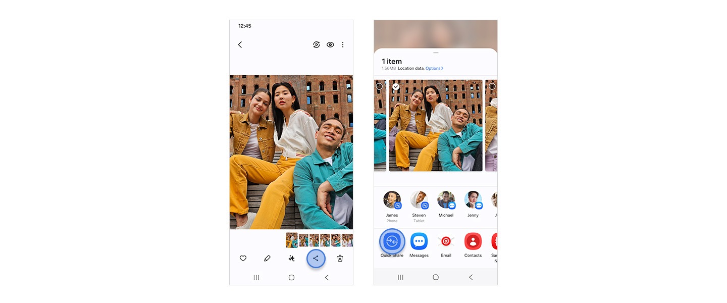 استمتع بمشاركة الملفات مع أصدقائك بسرعة وبسهولة باستخدام تطبيق Quick Share. فببضع نقرات فقط، ستتمكن من إرسال الصور ومقاطع الفيديو والمستندات والمزيد. بل وستتمكن من مشاركة الملفات فيما بين أجهزة Galaxy وأجهزة الكمبيوتر التابعة لشركات أخرى.1, 2
