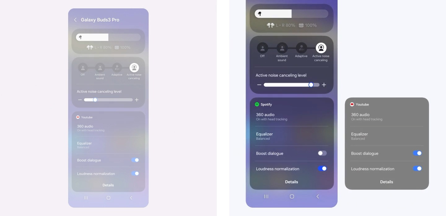 La pantalla de un smartphone Galaxy se desliza hacia abajo, lo que abre el panel de ajustes rápidos. Se amplía en el control deslizante de volumen, que se pulsa durante unos segundos para abrir un widget que muestra el nivel de batería de los Buds y el nivel de cancelación de ruido activo. Otra pantalla se amplía en el widget del nivel de cancelación de ruido activa, donde el nivel de ANC se desliza de izquierda a derecha. Debajo, un widget para el audio de YouTube muestra los ajustes para el audio 360, el ecualizador, la mejora del diálogo y la normalización del volumen. A continuación, cambia a un widget para el audio de Spotify, que muestra un conjunto diferente de ajustes de audio. Para Spotify, el audio muestra los ajustes para el audio 360, el ecualizador, el refuerzo de diálogo desactivado y la normalización de volumen activada. Por último, la vista se reduce para mostrar todos los ajustes mostrados anteriormente.