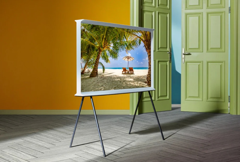 Coloca The Serif literalmente en cualquier lugar de la habitación. Viene con un elegante soporte de metal que encaja perfectamente con su marco. También destaca en espacios pequeños, y tienes la opción de quitar las peanas, lo que lo hace de él un televisor más versátil. Cámbialo de posición según tus gustos.