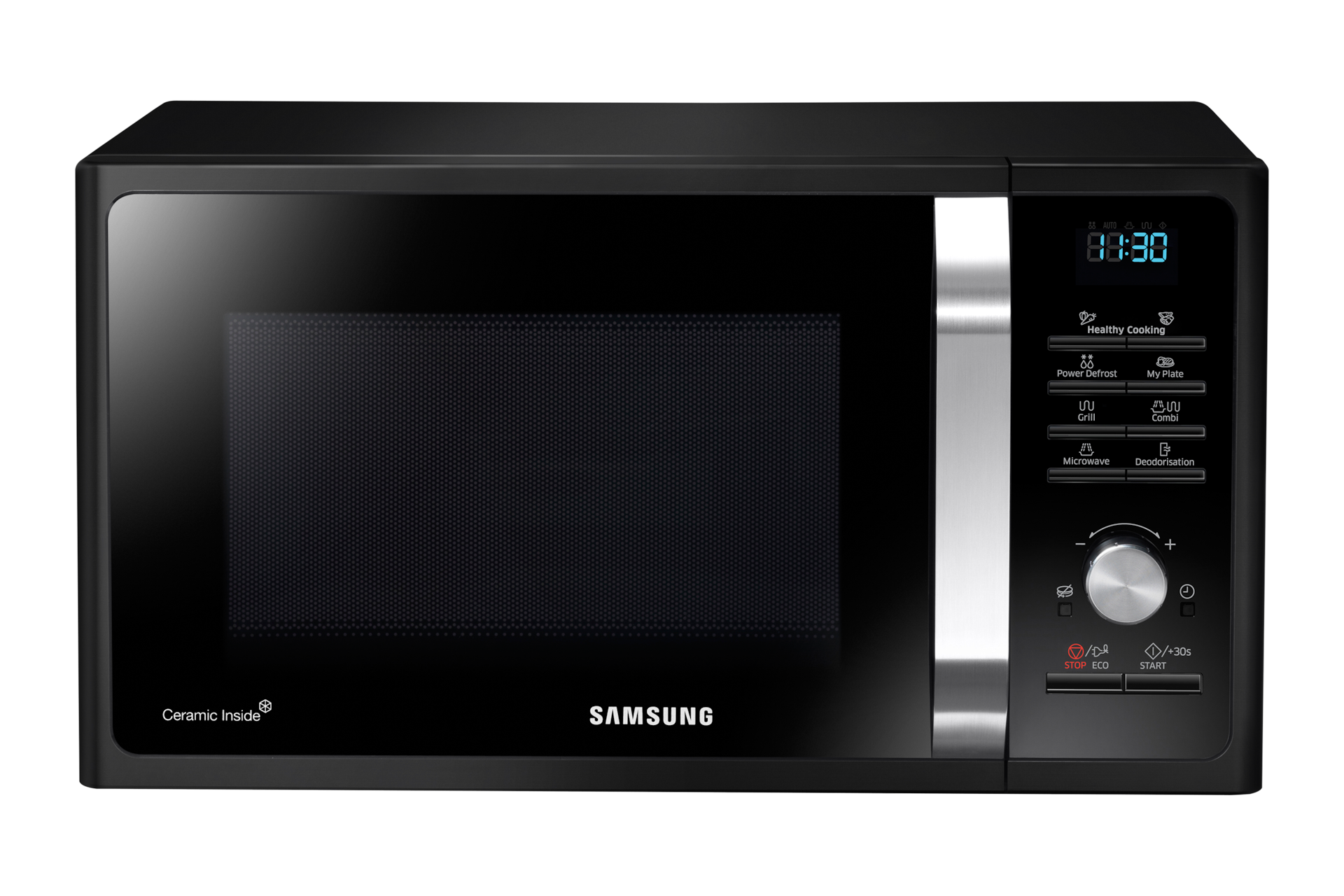 Dale un toque moderno y elegante a tu cocina con el nuevo horno microondas F300G de Samsung, gracias a su frontal negro acristalado con tirador Crystal Touch, el display en azul y su dial en color gris.