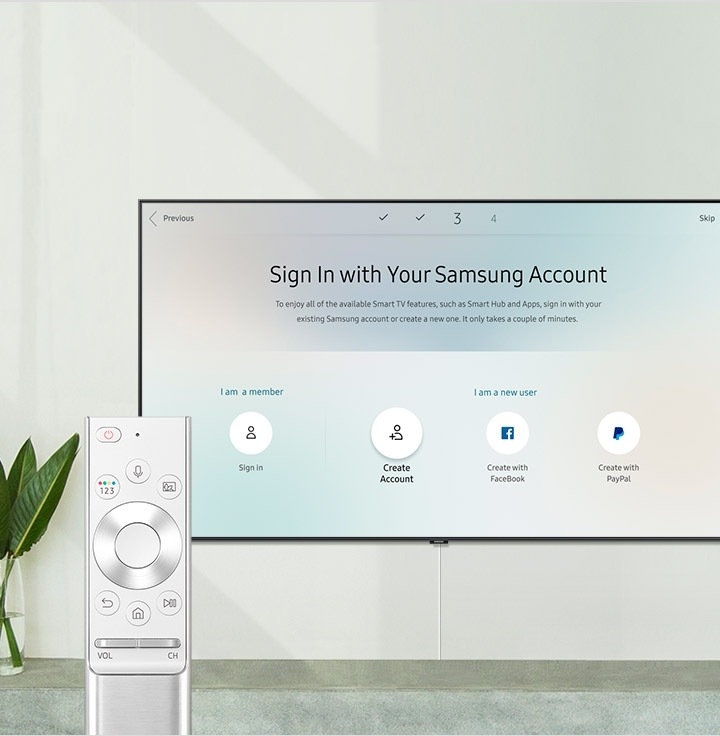 *Se necesita una "Samsung Account" para la configuración móvil. Disponible a través de la app SmartThingsTM, para smartphones Android (4.1 o superior) o iPhone (iOS 9.0 o superior). Se requiere conexión a intenet y “Samsung Account”. Los usuarios con dispositivos anteriores a Galaxy S6 o de otras marcas, necesitarán descargar la app SmartThingsTM desde su tienda de aplicaciones. El proceso de configuración también está disponible mediante el mando a distancia.