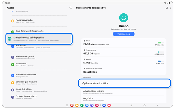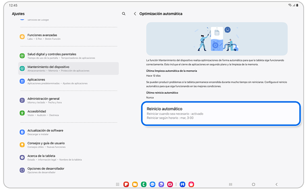 La función de reinicio automático ayuda a mantener tu tablet Samsung Galaxy en buen estado de funcionamiento reiniciando tu tablet periódicamente. Se puede activar y desactivar según sea necesario y solo ocurrirá cuando la tablet no esté en uso.