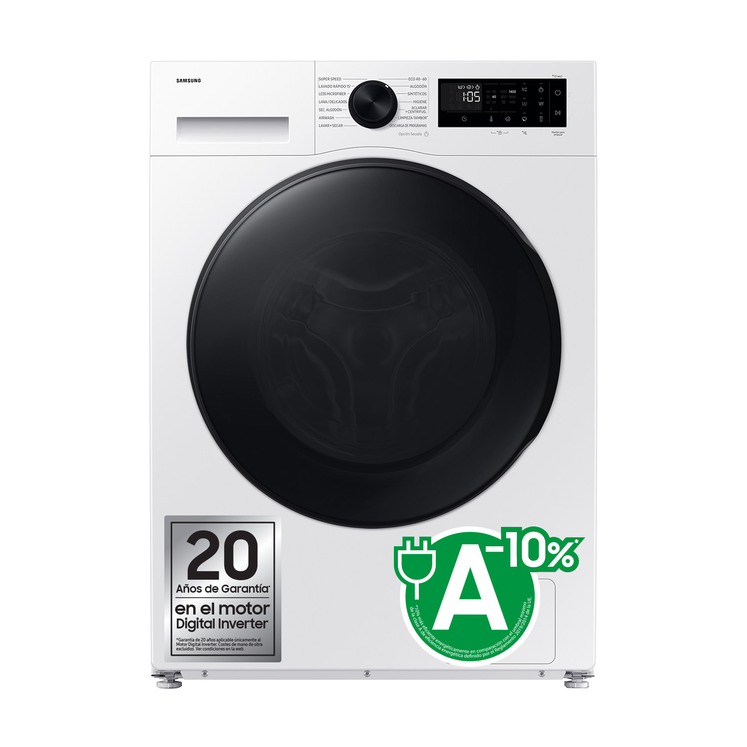 * Basado en pruebas internas de Samsung. El consumo de energía de este modelo de 9KG es de 45Wh / 100 ciclos, lo que supone un 10% más de eficiencia energética en comparación con el umbral mínimo de la clase de eficiencia energética A (50kWh / 100 ciclos para modelos de 9KG). Clasificación energética probada con el programa Eco 40-60, 10% de ahorro probado con el programa Eco 40-60.