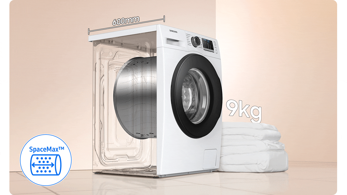 Lava más ropa en su espacioso tambor de 11Kg de carga con un fondo estándar de 600mm gracias a su diseño sencillo. La tecnología SpaceMax™ optimiza el espacio del dispositivo para crear un tambor más grande. Podrás lavar más prendas en cada lavado o prendas grandes como edredones y colchas*.
