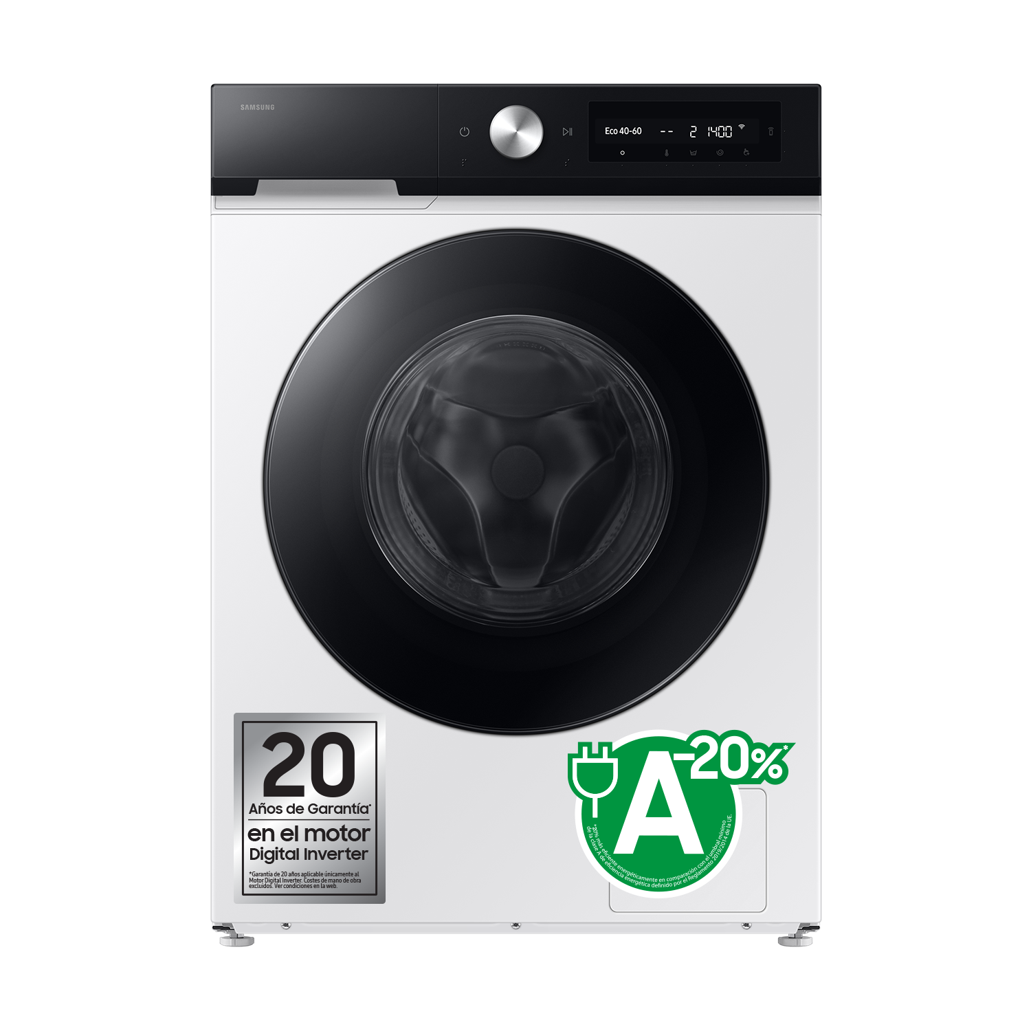 * Basado en pruebas internas de Samsung. Los modelos de la serie WW7400/7000D son un 20% más eficientes de lo requerido para alcanzar la clasificación energética A, según la regulación (EU) No 2019/2014. Los resultados podrían variar en función de las condiciones de uso.