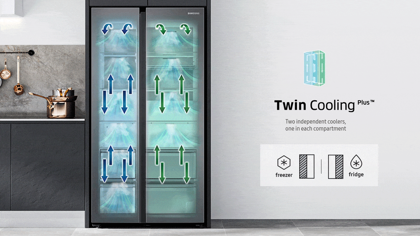 Varmista, että ruoka säilyttää kosteuden ja raikkauden kaksi kertaa pidempään*. Twin Cooling Plus™ optimoi jääkaapin ja pakastimen lämpötilan ja kosteuden itsenäisellä jäähdytyksellä. Se säilyttää ruoan paremmin ja suojaa makua estämällä hajujen sekoittumisen.
