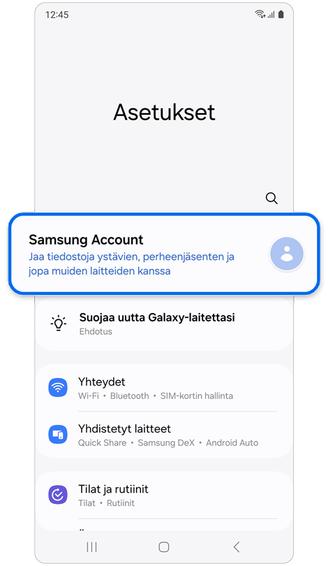 Tietokone: Siirry osoitteeseen account.samsung.com > Kirjaudu sisään > Profiili > Samsung account -tilin hallinta tai Muokkaa henkilökohtaisia tietoja. Matkapuhelin: Asetukset > Samsung account -tili > Profiilitiedot.