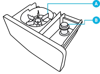 - Nestemäisen pyykinpesuaineen lokero (B): Lisää suositeltu määrä nestemäistä pesuainetta nestemäisen pesuaineen lokeroon. Jos käytät jauhemaista pesuainetta, poista nestemäisen pesuaineen lokero. Pesukone ei annostele jauhemaista pesuainetta nestemäisen pesuaineen lokerosta.