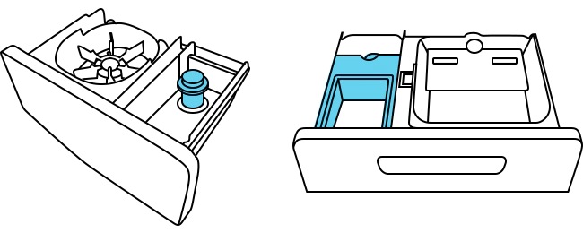 Joskus saattaa käydä niin, että pesuainelokeroon jää pesuainetta eikä se tyhjene. Se voi johtua useista syistä eikä tavallisesti kyseessä ole tuotevika. Alla on esitetty kaksi pesuainelokeroiden mallia edestä ja päältä täytettävissä koneissa. Katso nämä pesuainelokerotapaukset ja noudata annettuja ohjeita.