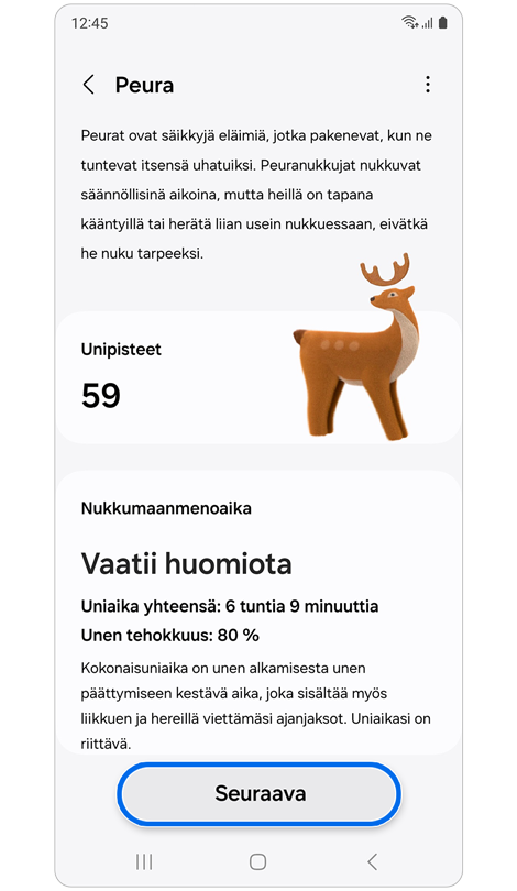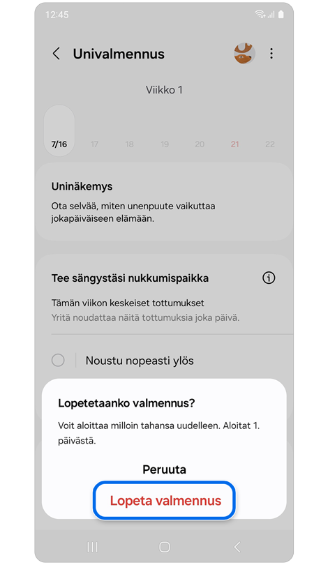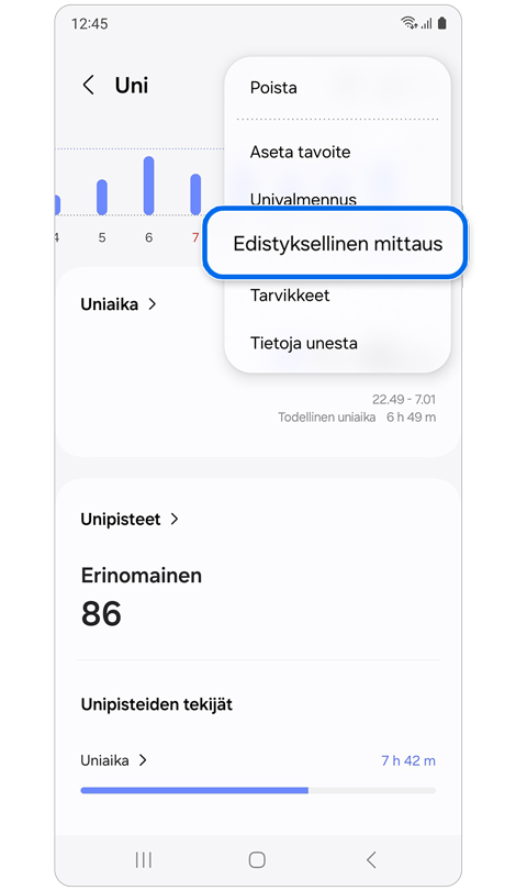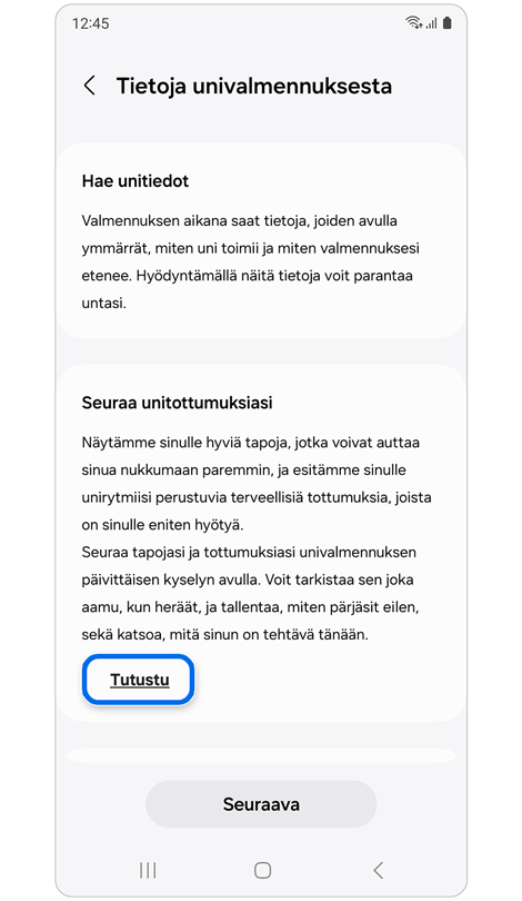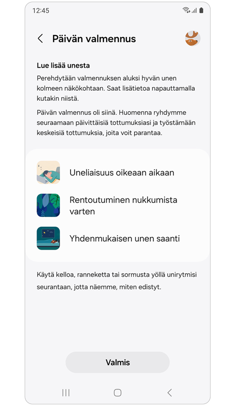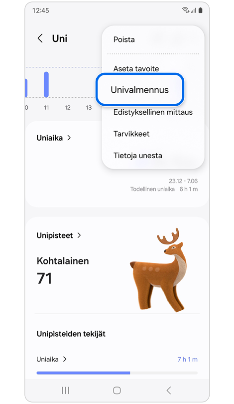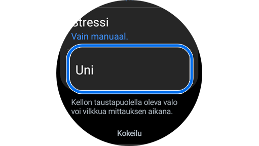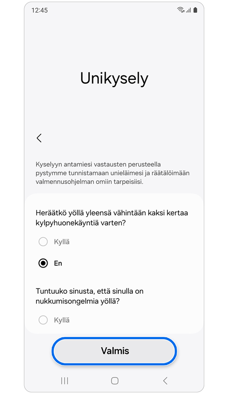 * Sinun on käytettävä Galaxy Watch- tai Fit-laitettasi vähintään 7 yötä ennen kuin voit käyttää “Univalmennus” -ominaisuutta.