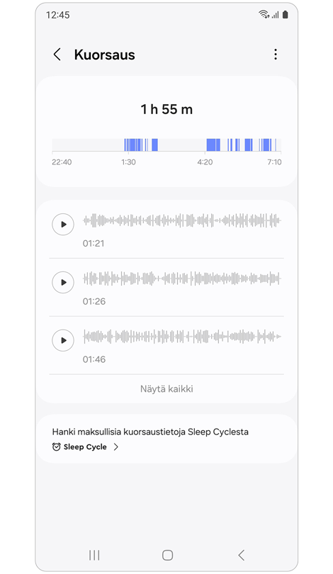 Voit seurata kuorsausta nukkuessasi Samsung Health -sovelluksella. Käyttääksesi tätä ominaisuutta varmista, että Galaxy Watch tai Fit on yhdistetty puhelimeesi Galaxy Wearable -sovelluksen kautta.
