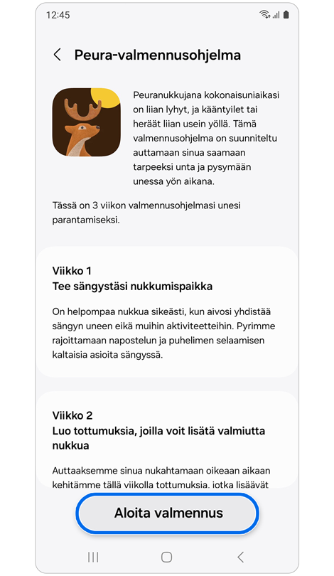 Samsung Health seuraa ja analysoi unesi rytmiä käyttämällä Galaxy Watch- tai Fit-laitteesi tallentamia tietoja ja luo sinulle neljästä viiteen viikkoa kestävän valmennusohjelman.