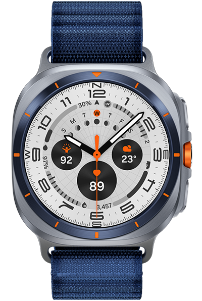 Galaxy Watch Ultraa on saatavilla väreinä Titanium Gray, Titanium Silver, Titanium White ja nyt myös Titanium Blue. Uusi väri on raikas lisä valikoimaan, jossa jokainen sävy on upea omalla tavallaan. Monipuolisten rannekkeiden ansiosta kaikki neljä väriä ilmentävät Galaxy Watch Ultran seikkailuvalmiutta.