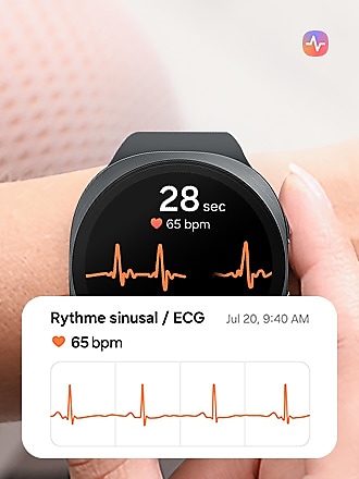 - 30. L’usage de l’électrocardiogramme et de la fonctionnalité notification de rythme cardiaque irrégulier (IHRN) via l’application Samsung Health Monitor est un dispositif médical de classe IIa portant le marquage CE au titre de cette réglementation. Fabriqué par Samsung Electronics Co., Ltd. (Corée du Sud), l’évaluation de la conformité a été réalisée par l’organisme notifié DNV GL Presafe AS (CE2460). Destiné à être utilisé sur les montres et téléphones Samsung Galaxy compatibles. Veuillez noter que la disponibilité peut varier selon le pays. Veuillez l'utiliser après avoir lu les « Précautions avant utilisation » et les étapes 1 à 4 de la section « Mode d'emploi ». Non destiné aux utilisateurs présentant des arythmies connues autres que la fibrillation auriculaire, ni aux utilisateurs âgés de moins de 22 ans. Lire attentivement les conditions d’utilisation. Pour plus d’informations, veuillez-vous rapprocher de votre professionnel de santé. Les utilisateurs ne doivent pas interpréter les résultats ni prendre de mesures cliniques sur la base des données fournies par l'appareil sans consulter un professionnel de santé qualifié. Le dispositif ECG n'est pas destiné à remplacer les méthodes traditionnelles de diagnostic ou de traitement. Pour plus d’informations, veuillez-vous rapprocher de votre professionnel de santé