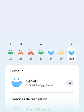 La pleine conscience est aussi importante que la santé physique pour un bien-être holistique. Apprenez à connaître vos niveaux de stress et détendez-vous avec des exercices de respiration et de méditation. Faites le point sur vous-même chaque jour avec Samsung Health.13