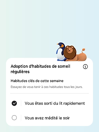 Qu’est-ce que le Coaching sommeil ?Le Coaching sommeil est une fonctionnalité qui fournit un programme de Coaching sommeil personnalisé basé sur vos données de sommeil. Portez votre Galaxy Watch ou Ring pendant au moins 7 jours pendant votre sommeil, y compris au moins 1 jour de travail et 1 jour de repos. Une fois suffisamment de données collectées, un animal de sommeil vous sera attribué et le programme commencera.3