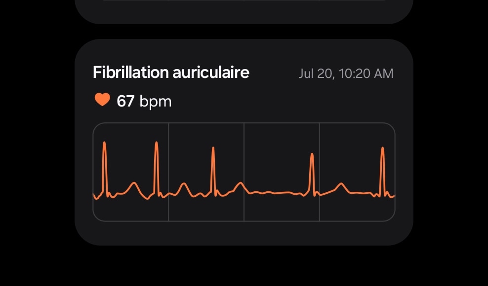 Comment puis-je passer un test ECG ?Vous pouvez effectuer des tests ECG avec la Galaxy Watch qui prend en charge l’application Samsung Health Monitor et aider à vérifier les signes possibles de fibrillation auriculaire. 30 Dans certains pays ou régions, vous pouvez recevoir des alertes qui peuvent vous aider à vous rappeler de faire un test ECG lorsque des signes de rythme cardiaque irrégulier sont détectés alors que la Galaxy Watch est à votre poignet. La fonction de test ECG est prise en charge sur la série Galaxy Watch4 et les modèles de Samsung Galaxy Watch sortis ultérieurement (à l’exclusion de Galaxy Fit) avec Wear OS 5.0 ou version ultérieure, et est prise en charge sur les smartphones Android (Android 12 ou supérieur). La disponibilité peut varier en fonction du pays ou de la région. Consultez le site https://www.samsung.com/fr/apps/samsung-health-monitor pour plus d’informations et les dernières mises à jour concernant les pays desservis.