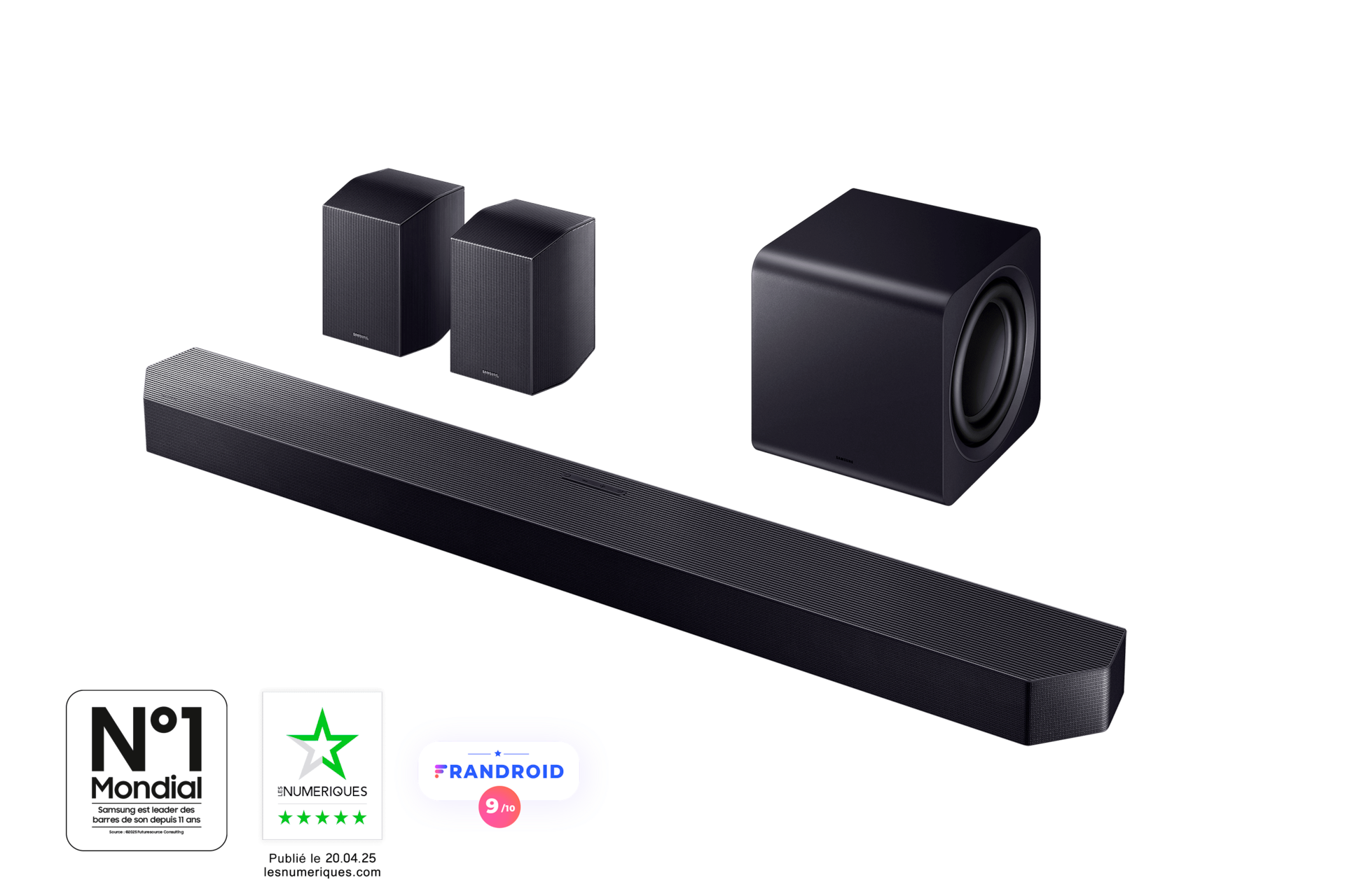 La technologie Q Symphony est compatible avec les téléviseurs Samsung à partir de 2021 (TV 2021 AU7000 et plus, TV 2022 BU8000 et plus, TV 2023 CU7000 et plus, TV 2024 DU7000 et plus et TV 2025 U80 00 F et plus & The Frame 2022 2025). Elle nécessite une connexion HDMI, optique ou Wi-Fi au téléviseur.